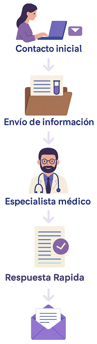 Una vez recibamos tu correo, te indicaremos cómo compartir los informes clínicos, pruebas genéticas (si las hay) y las dudas específicas para que el equipo médico pueda revisarlo.